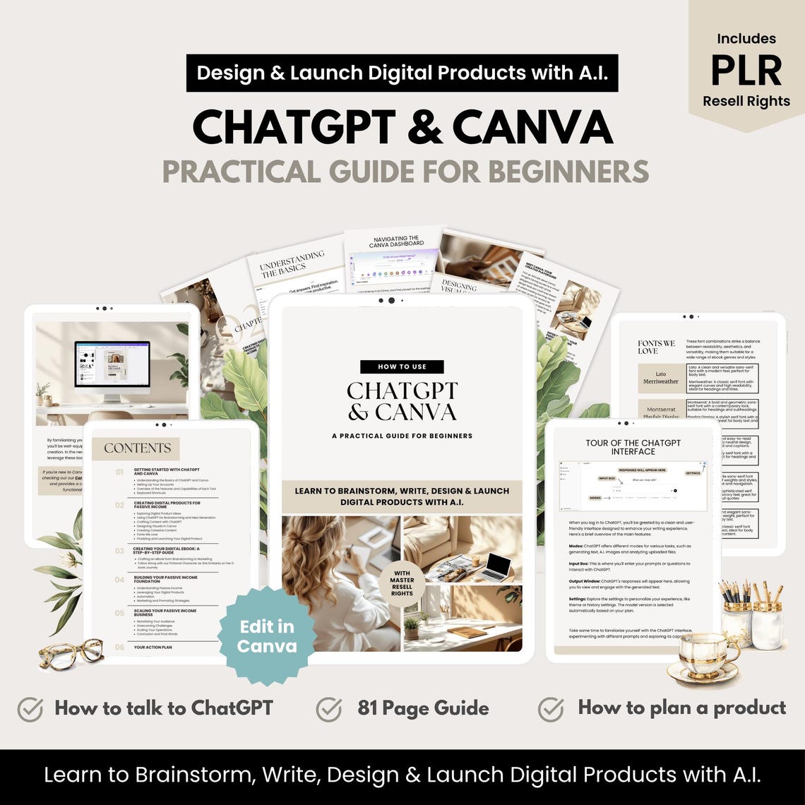 ? ChatGPT & Canva Beginner Guide | Digital Product Creation eBook | AI & Canva PLR Template | 87 Page Editable