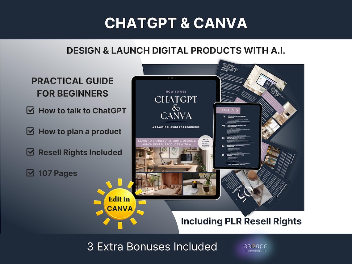 ? ChatGPT & Canva Beginner Guide | 107 Page Editable eBook | PLR + MRR Included | Create & Launch Digital Produ