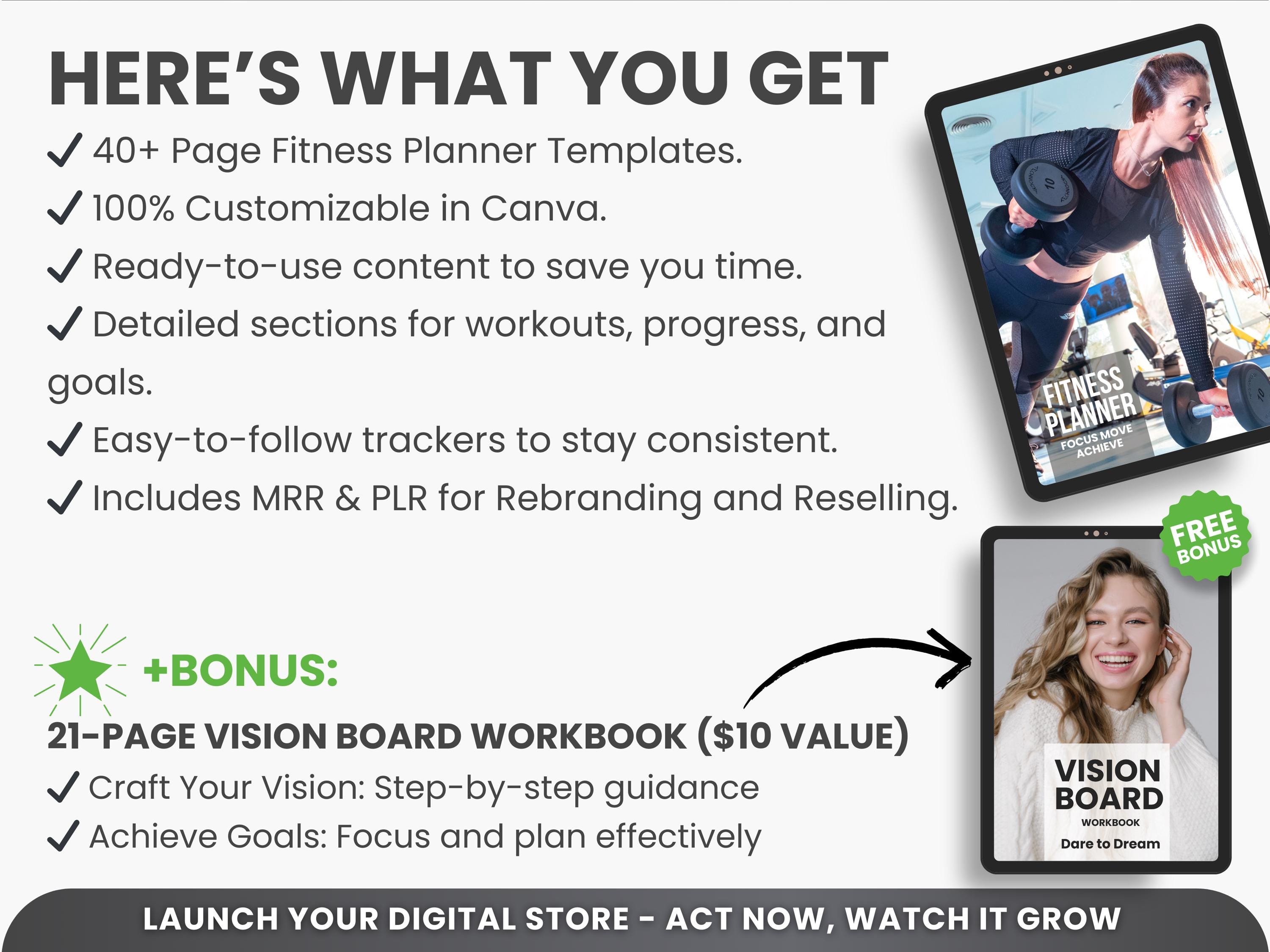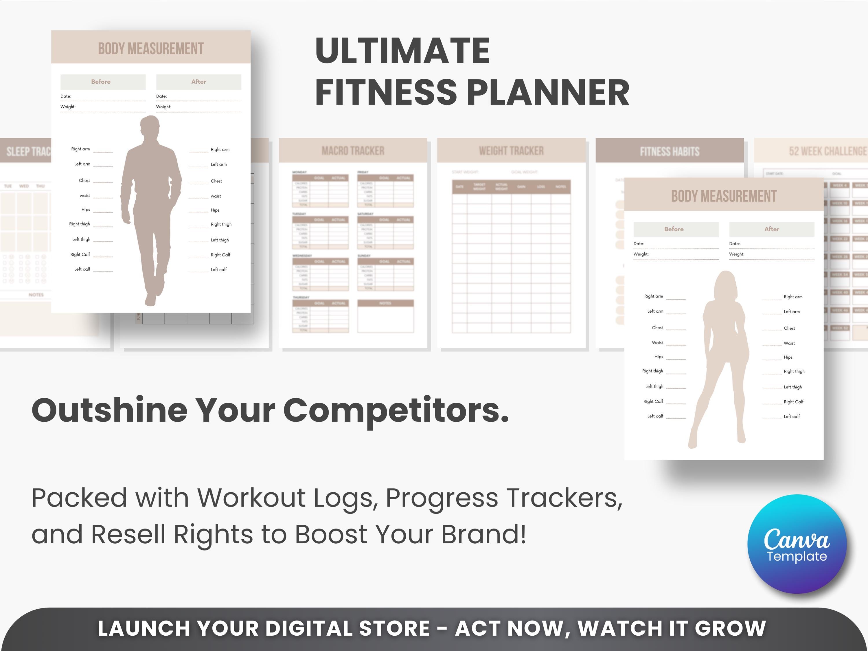 Ultimate Fitness Planner Bundle PLR & MRR – Editable Canva Workout Planner, Meal Planner, Weight Loss Tracker, Gym Log Book for Resell