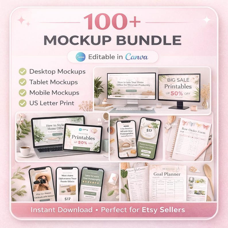 All mockups are **fully editable in Canva**, so you can simply drag and drop your design to create beautiful product images for your shop, website, or social media.