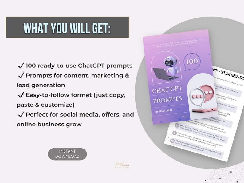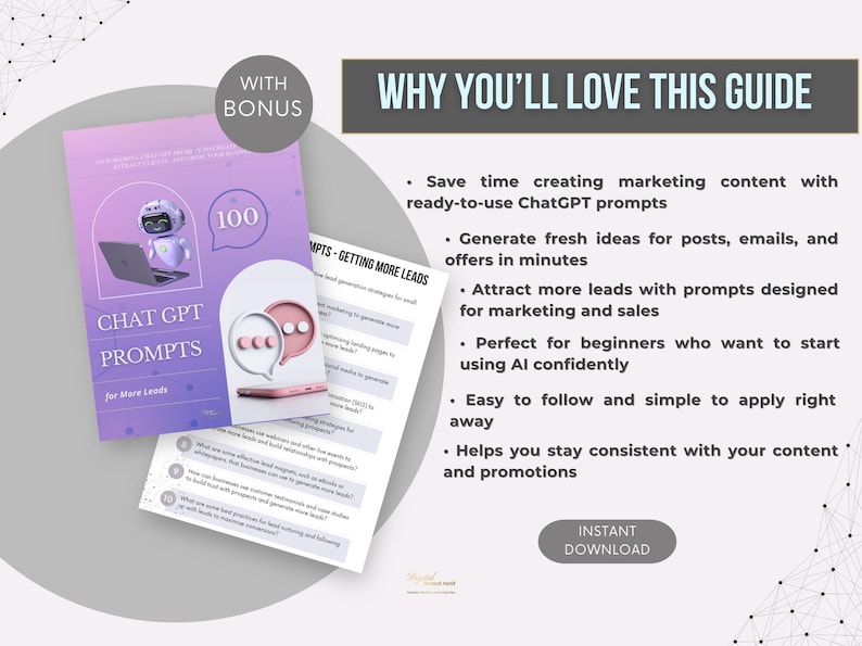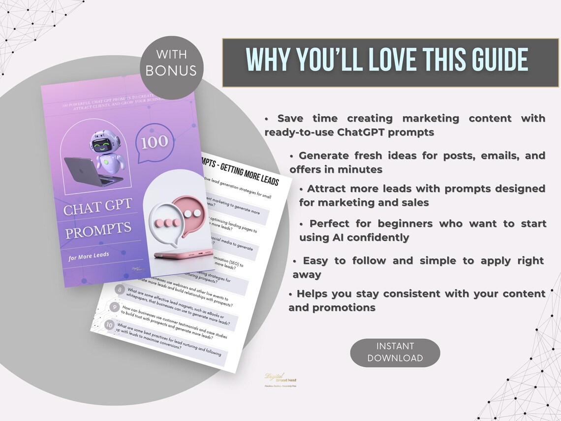 This guide gives you 100 powerful ChatGPT prompts designed to help you create engaging content, attract your ideal audience, and generate more leads, without burnout.