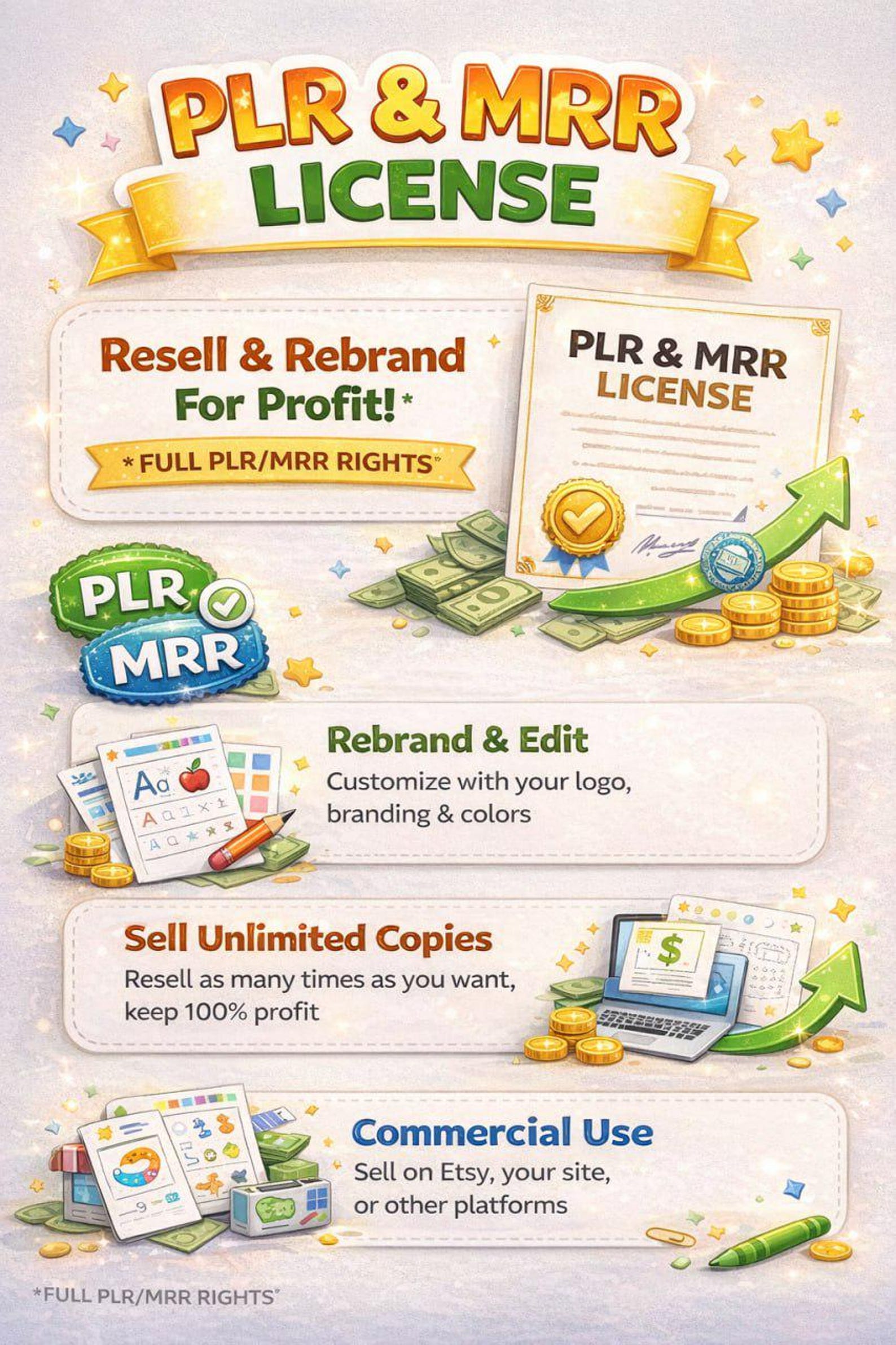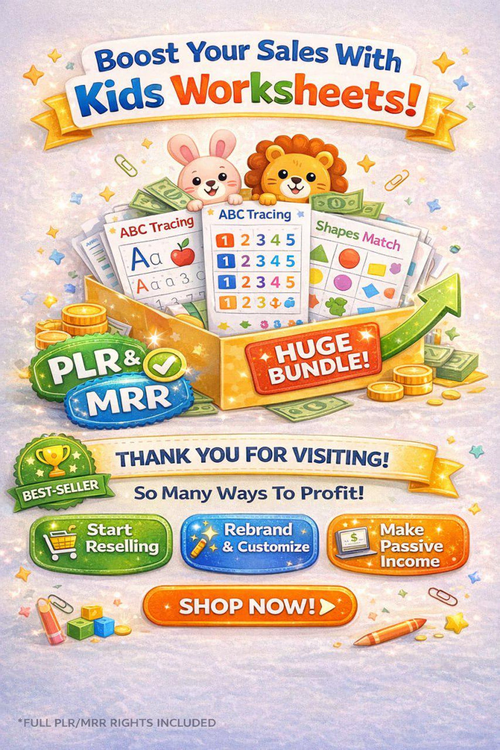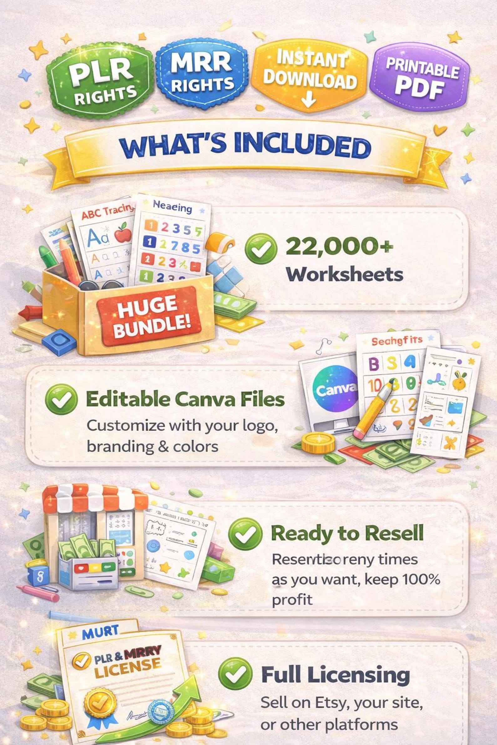 This 22,000+ page Kids Learning Worksheets Vault gives you everything in one place: engaging educational printables plus PLR & MRR rights to use, rebrand, or resell.
