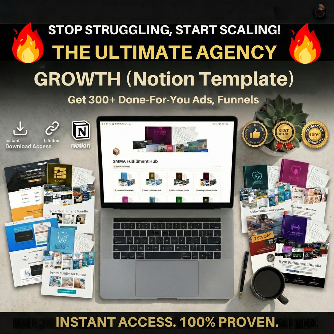 Boost your productivity and scale your business with this 300+ Notion Template Bundle, designed for entrepreneurs, agencies, creators, and business owners. This all-in-one collection includes swipe files, SMMA fulfillment systems, email nurture sequences, client acquisition tools, and niche-specific templates — all organized beautifully inside Notion.