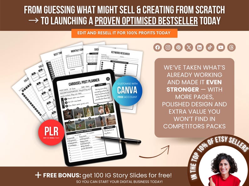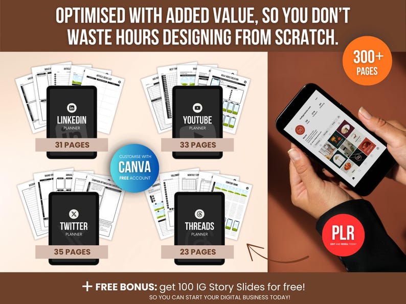That all changed when I created this 300+ Page Social Media Planner Bundle | Editable Canva Templates | PLR Resell Rights | Printable Content Calendar Kit, a ready-to-sell digital product that instantly saves time and earns 100% profit.