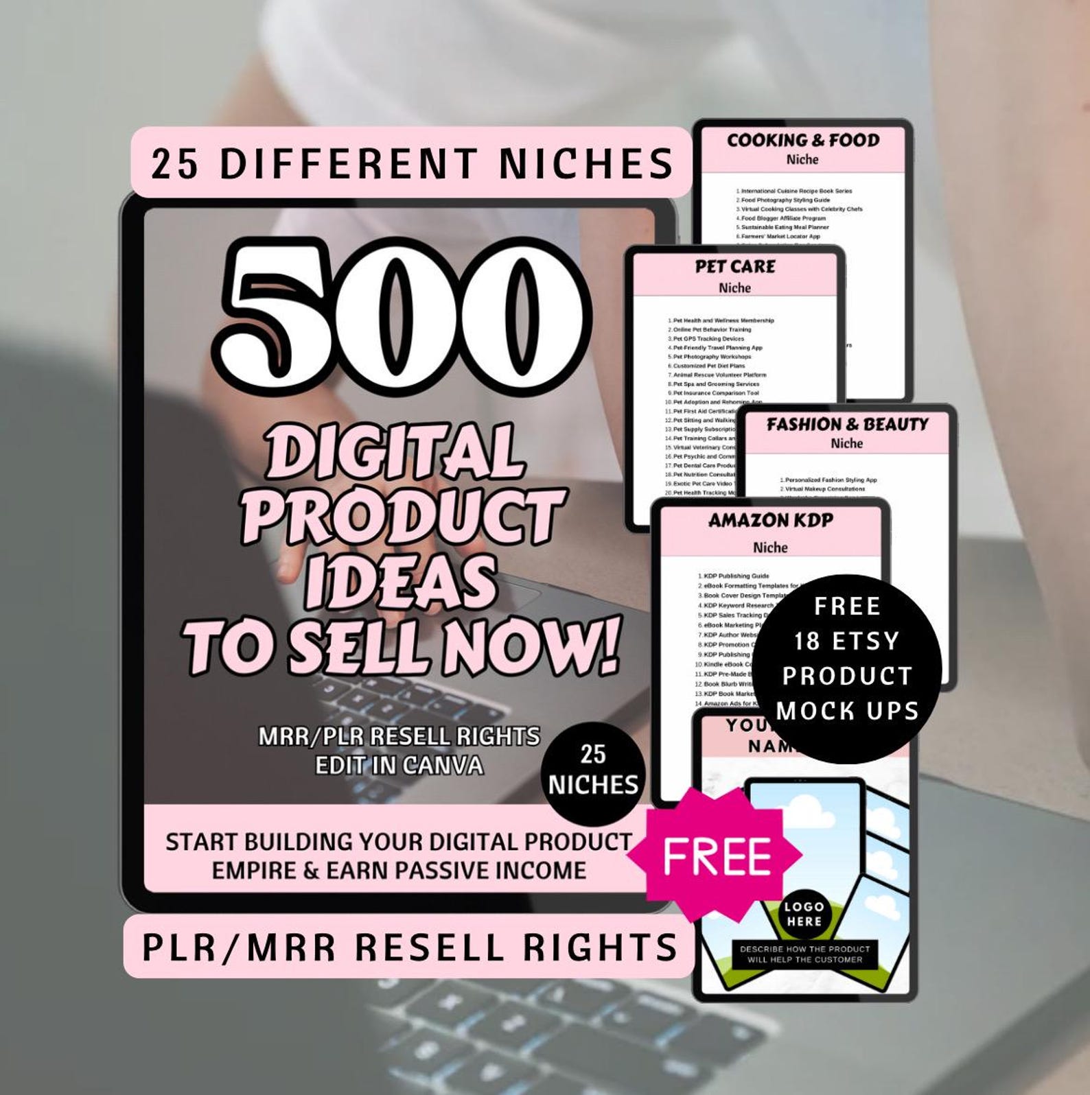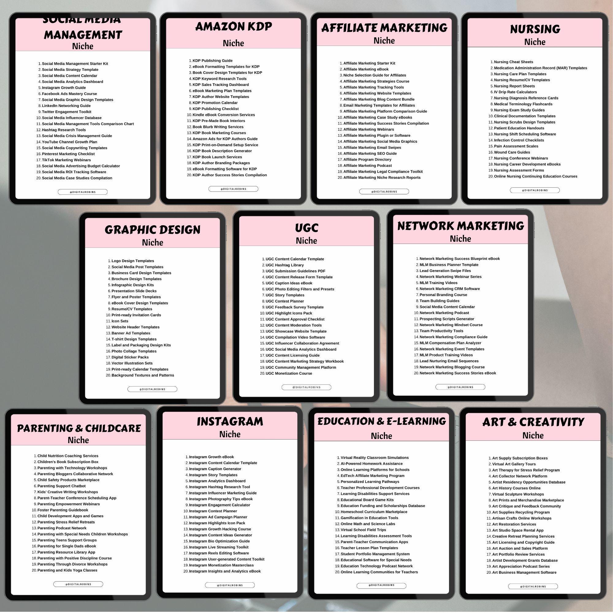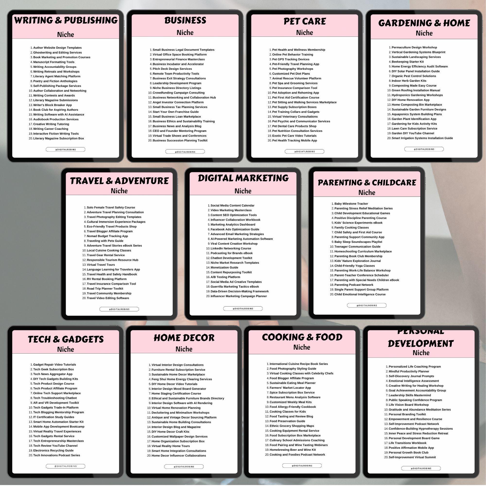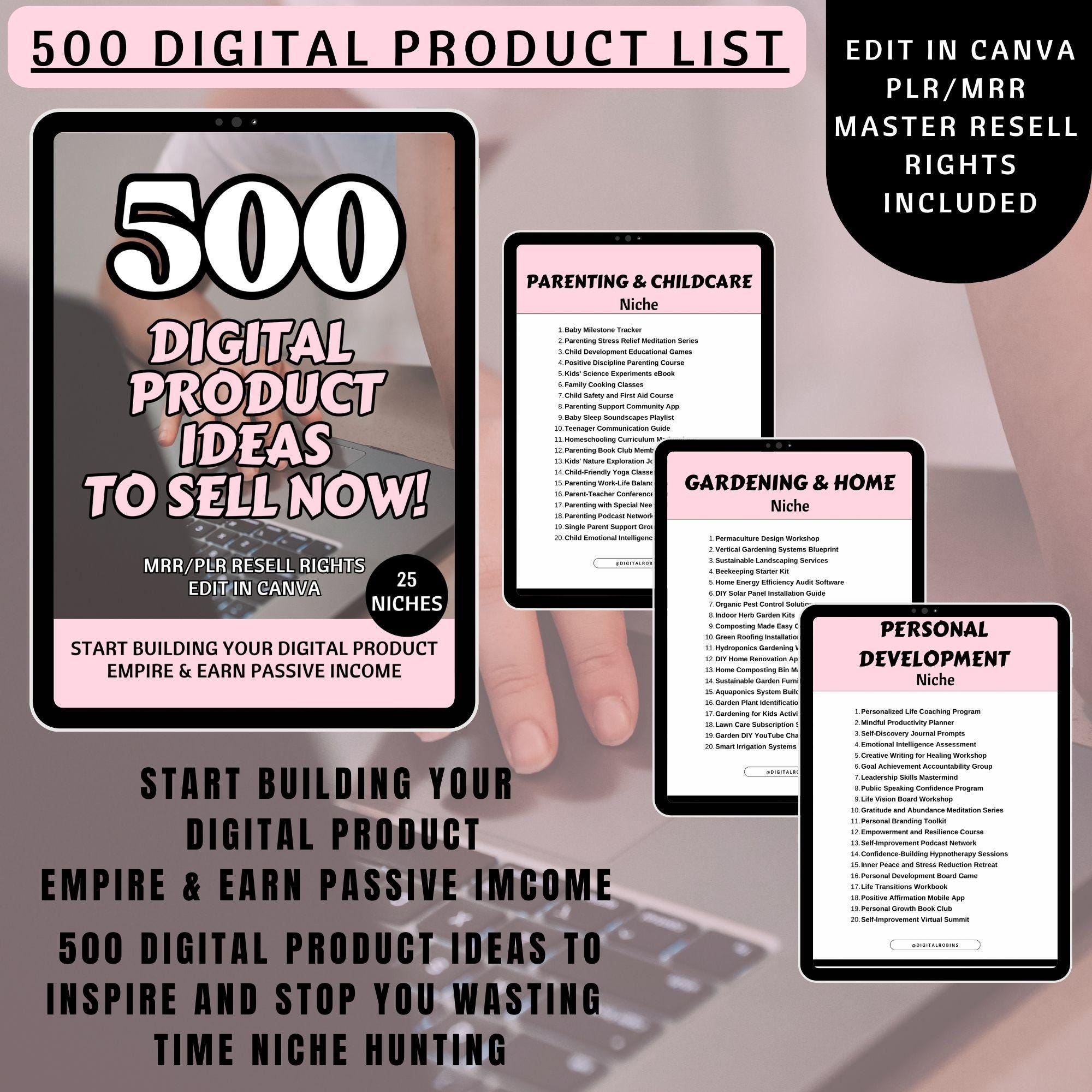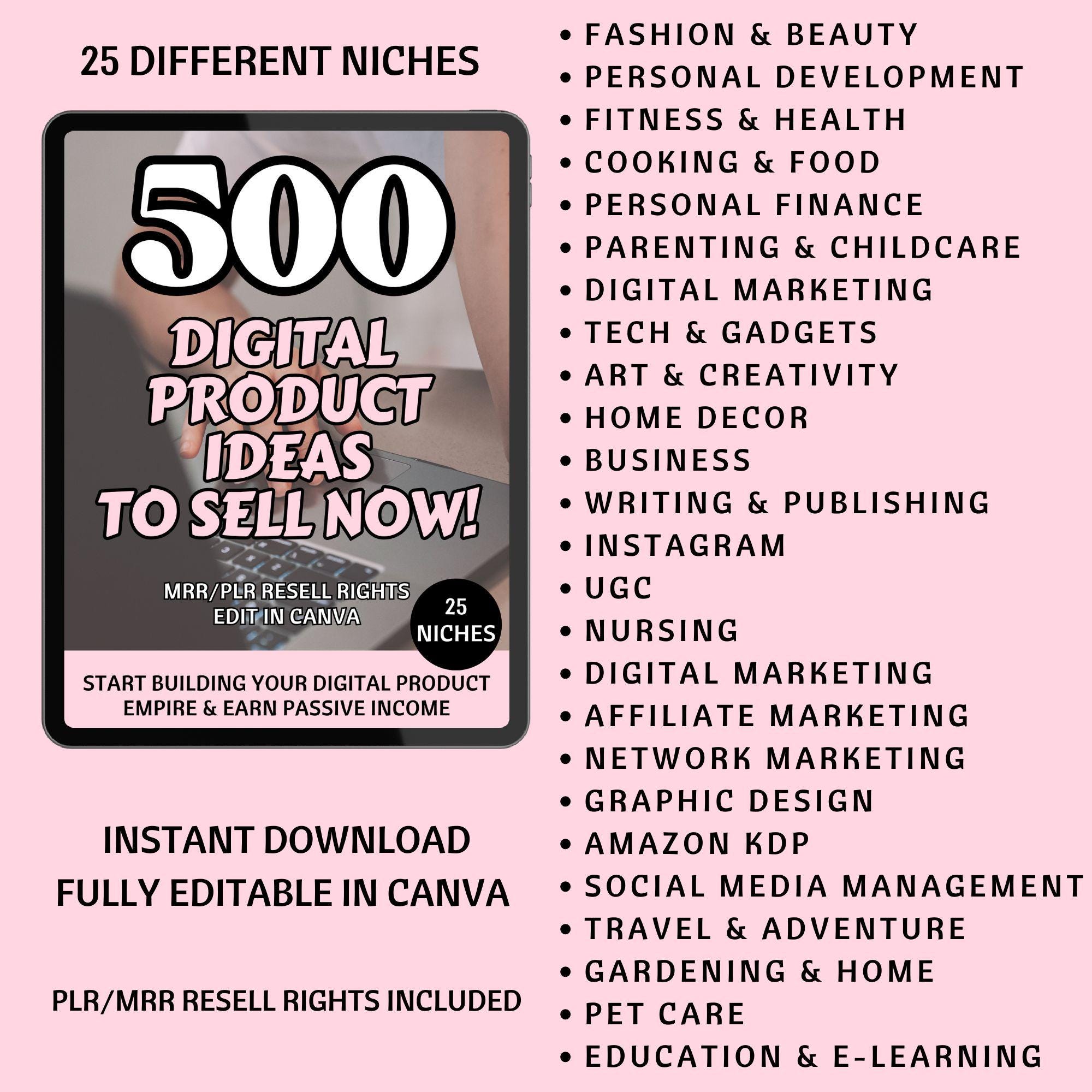 500 Digital Product Ideas in 25 different niches with 20 ideas per page