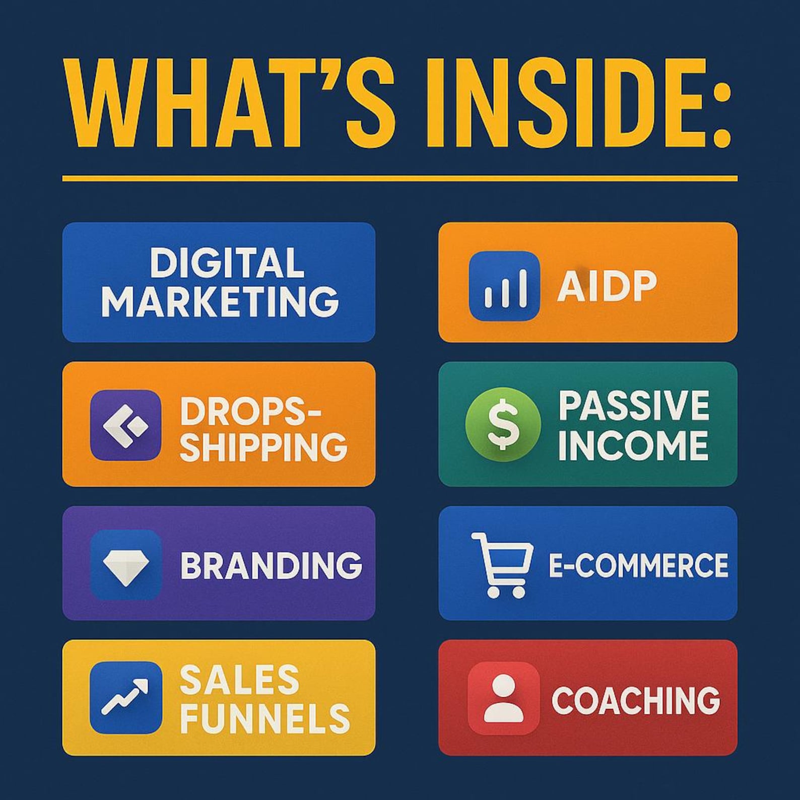 The content covers areas such as digital marketing, e-commerce, dropshipping, branding, AI tools, coaching, automation, and online business fundamentals.