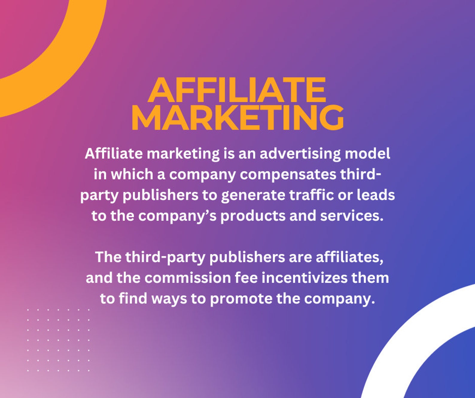Affiliate marketing is an advertising model in which a company compensates third-party publishers to generate traffic or leads to the company’s products and services. The third-party publishers are affiliates, and the commission fee incentivizes them to find ways to promote the company.