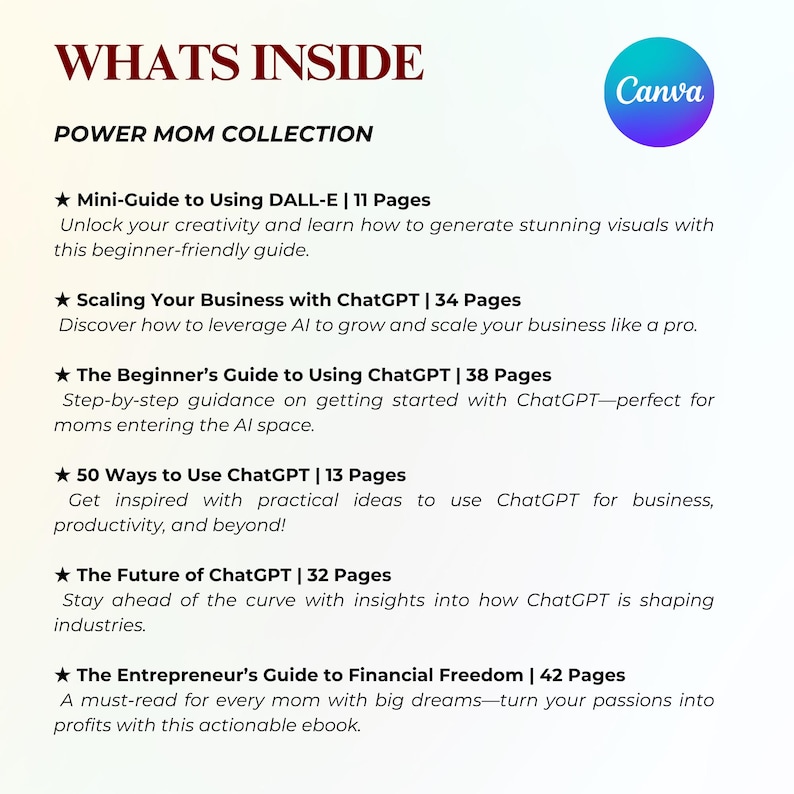 Empower your entrepreneurial journey with the Power Mom AI Collection — a complete 9 eBook bundle designed to help moms leverage AI tools like ChatGPT and DALL-E to build, grow, and automate their online businesses.