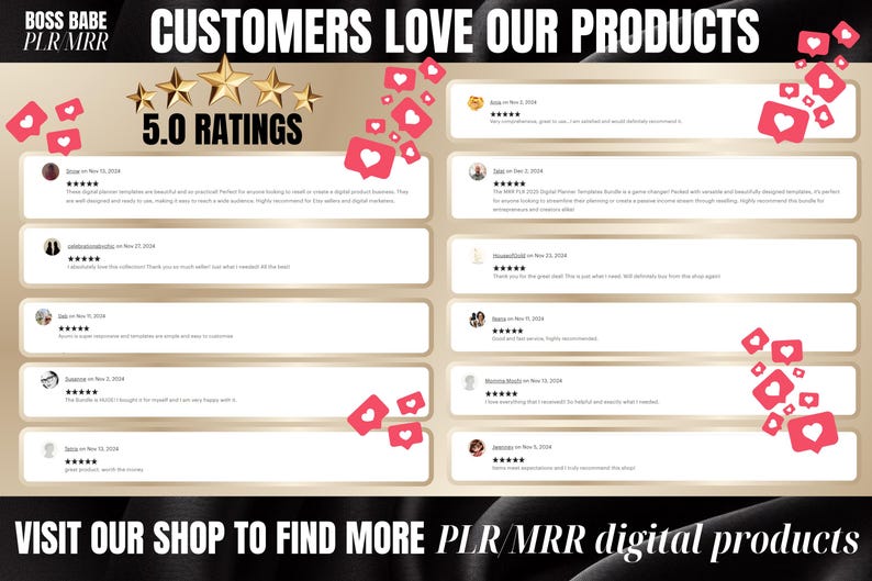 Boss Babe PLR MRR is all about helping etsy sellers and digital product sellers make it easy for you to kickstart and expand your digital businesses with premium PLR and MRR products, so favorite our shop to get future updates!!