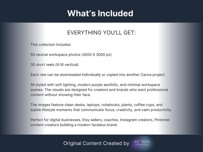 Each visual was generated and curated to follow a modern workspace aesthetic so creators and digital businesses can build a cohesive faceless brand.