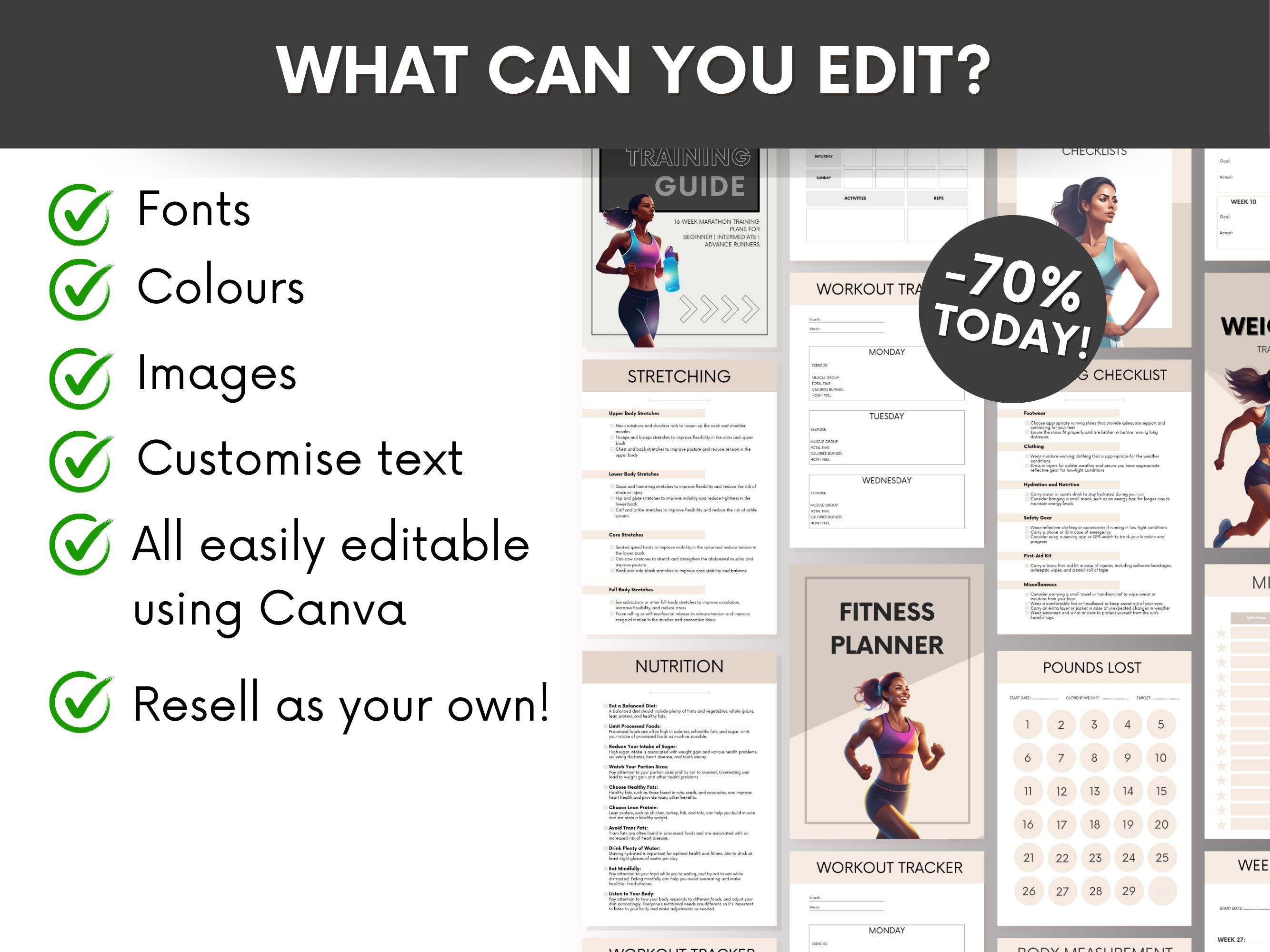 You can now save sooo much time by selling high-quality guides, packed with valuable fitness information to pass on to your clients. All products are easily editable in Canva, allowing you to customise them to fit your brand or resell as-is!