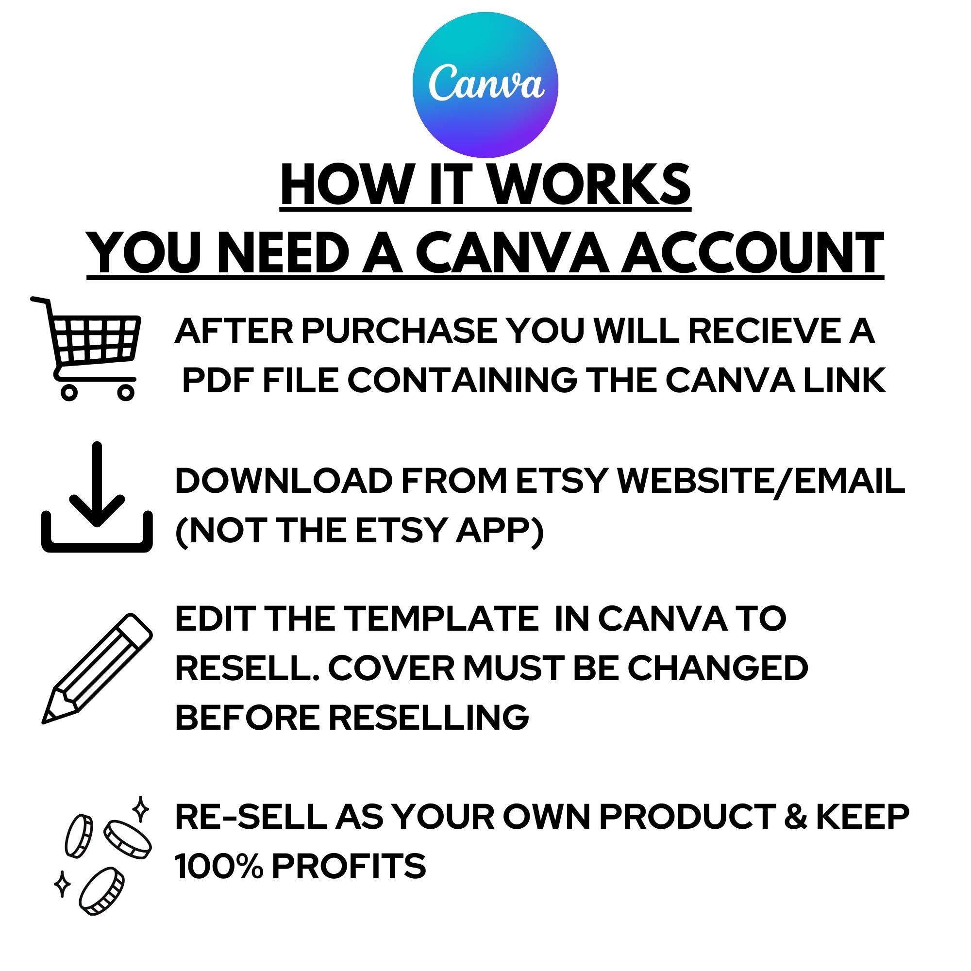 You will receive a PDF with easy clickable links for Canva(Canva Pro is needed to create resellable link) and Google Drive access which ever you prefer.